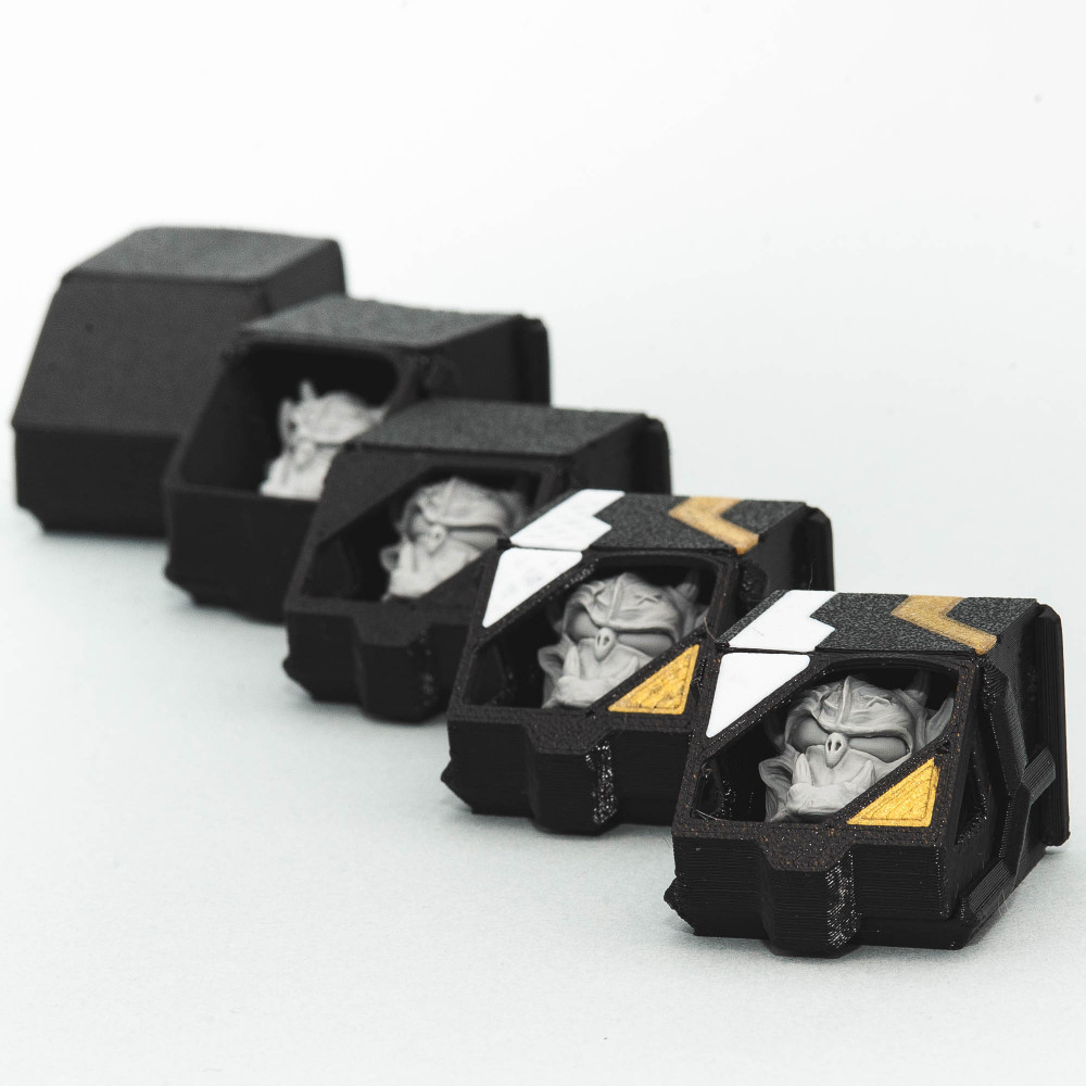3D printed from very durable PETG using cutting edge multi-color printing and with a golden anodized aluminium hinge, this case also doubles as a collectors case and place to store your caps ID card.